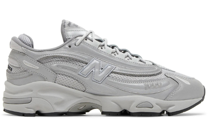 The New Balance 1000 ‘Reflective Pack – Raincloud’ features a breathable mesh base with durable synthetic leather overlays in a reflective finish. Metallic silver accents land on the tongue, marked with New Balance 1000 branding. A sculpted polyurethane midsole, enhanced with ABZORB cushioning in the forefoot and heel, maintains the monochrome aesthetic.